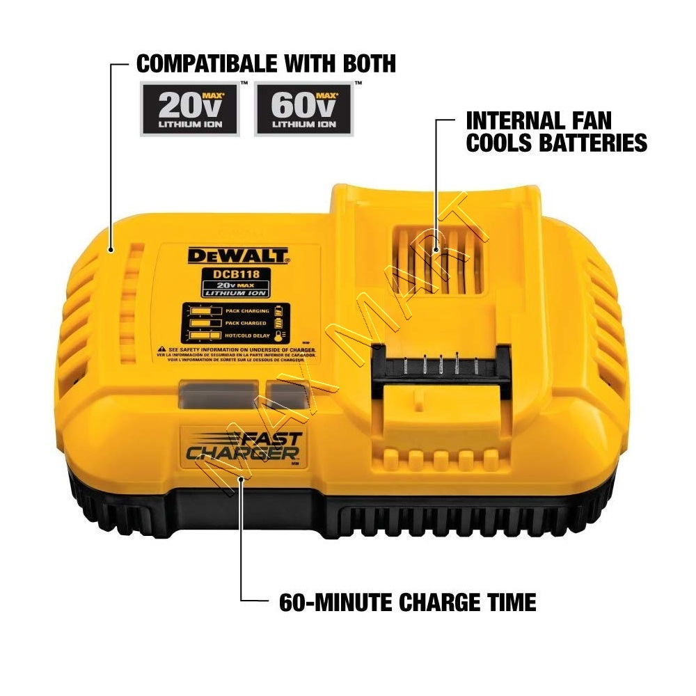 The DEWALT DCB118 Fast Charger is compatible with all 20V max and 60V flexvolt DEWALT batteries. It is a fan-cooled charger designed to reduce charge time.